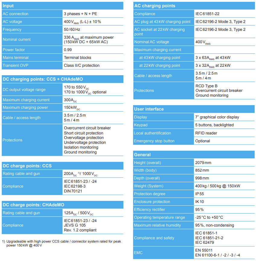 It offers simultaneous charging for four cars in total; two cars with dynamic DC charging and two cars with AC charging. With 150kW DC charging power and due to its upgradability to 1000V charging technology the system is prepared for the fast charging of the electrical vehicles of tomorrow. The System Design for DC charging is modular consisting of efficient power modules. That enables the operator to start today with lower power at lower cost and add on more power when required in the future.